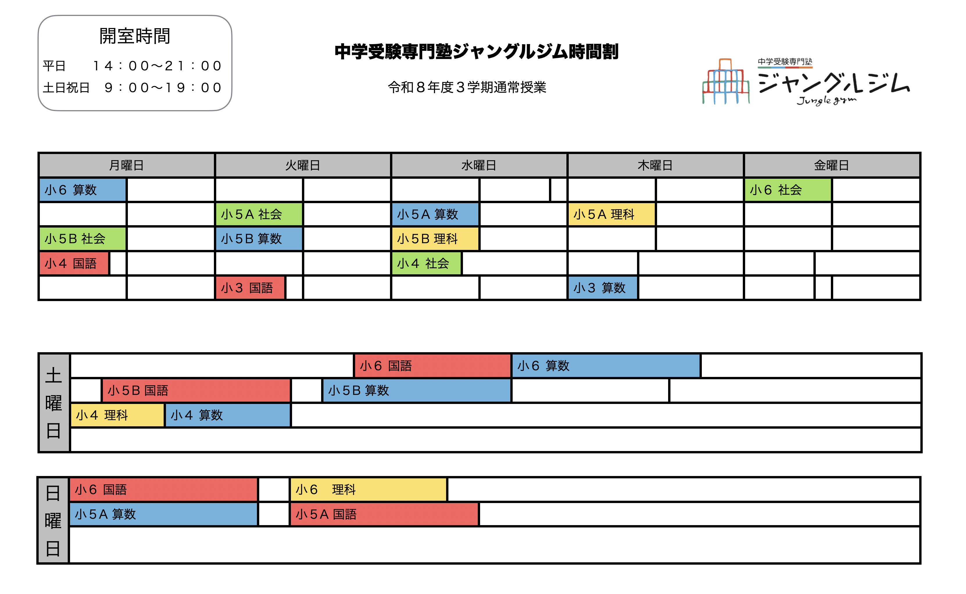 受講プログラムジャングルジムの授業要項・時間割ジャングルジムの現在(令和7年度2学期通常授業)の授業予定はこちらとなっております。 令和8年度3学期通常授業 要項はこちらジャングルジムの1年間の予定ジャングルジムでの学びは1月31日を年度末、2月6日を年度始めとする年間予定で進行しております。 受講料ジャングルジムは中学受験にかかる費用について、ホームページの方で公開しております。 費用についてはこちら